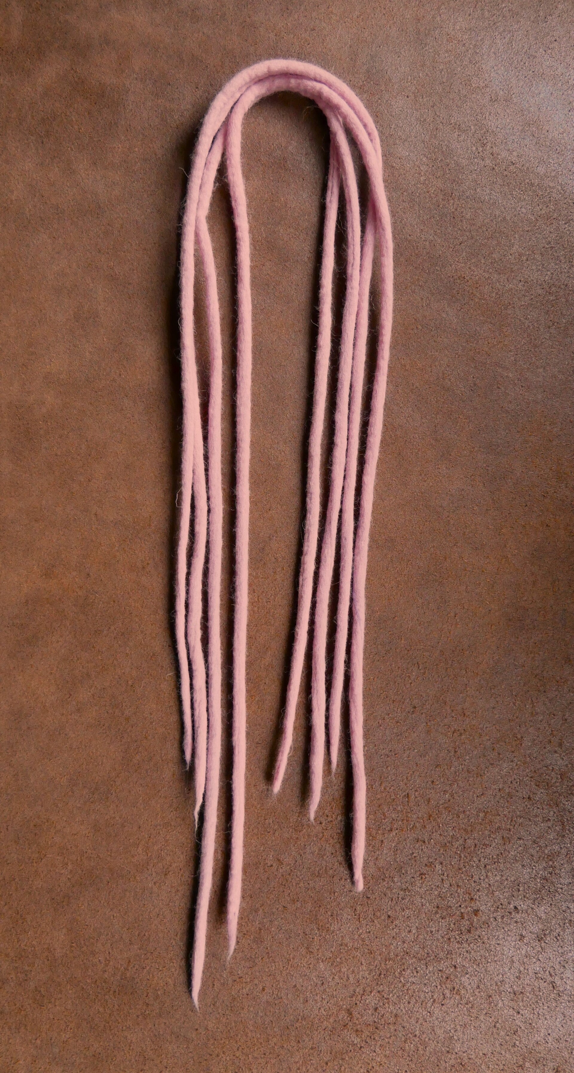 het is een natuurlijk product dat gemaakt is van merinowol. Ze worden door mij tot dreads gemaakt. De lengtes en diktes kunnen soms wat van elkaar verschillen door dat het wol de ene keer wat meer krimpt en vilt dan de ander tijdens het maken ervan. Bij het samen stellen van de dreads zoek ik de meest bij elkaar passende lengtes en diktes bij elkaar uit zodat dat er geen verschil tot bijna geen verschil is.