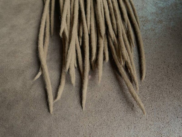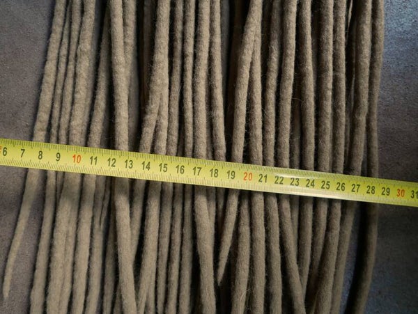 het is een natuurlijk product dat gemaakt is van merinowol. Ze worden door mij tot dreads gemaakt. De lengtes en diktes kunnen soms wat van elkaar verschillen door dat het wol de ene keer wat meer krimpt en vilt dan de ander tijdens het maken ervan. Bij het samen stellen van de dreads zoek ik de meest bij elkaar passende lengtes en diktes bij elkaar uit zodat er geen verschil tot bijna geen verschil is.