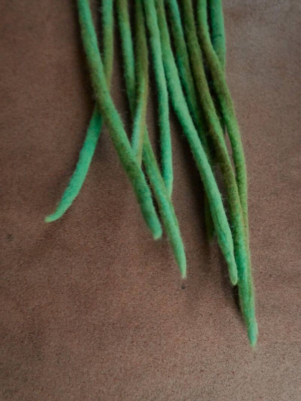 het is een natuurlijk product dat gemaakt is van merinowol. Ze worden door mij tot dreads gemaakt. De lengtes en diktes kunnen soms wat van elkaar verschillen door dat het wol de ene keer wat meer krimpt en vilt dan de ander tijdens het maken ervan. Bij het samen stellen van de dreads zoek ik de meest bij elkaar passende lengtes en diktes bij elkaar uit zodat er geen verschil tot bijna geen verschil is.