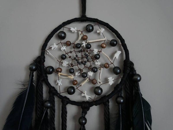 Met de handgemaakte dromenvanger. In deze dromenvanger zitten houten kralen en echte botjes die ik zelf heb gevonden op diverse plaatsen (voornamelijk in bossen) De hangsels zijn gevuld met houten kralen en veren van een haan. Het koordje boven kan korter gemaakt worden door er zelf een knoopje in te leggen op de gewenste hoogte.