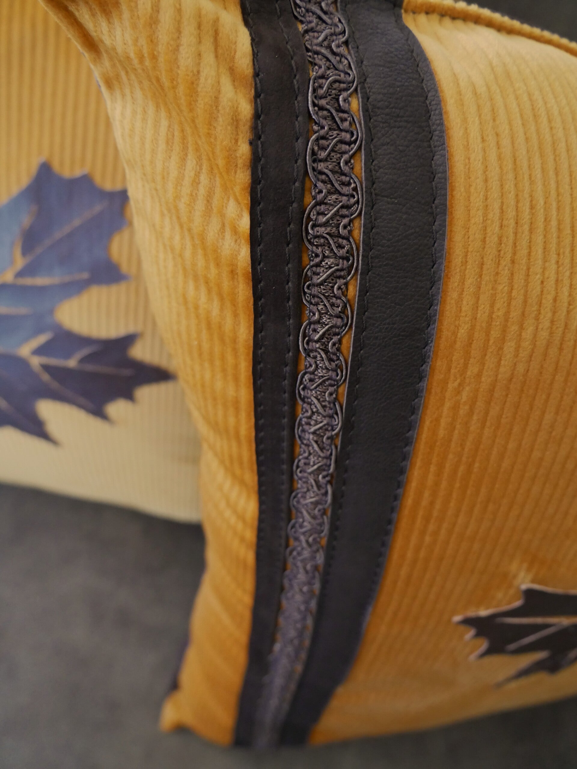 Mooie okergele kussen waarvan de voorkant gemaakt is van corduroy stof met lederen bruine stroken en sierbanden. Het bruine uit leer gesneden blad op de voorkant maakt het een echte eye catcher. deze kussen fleurt iedere bank helemaal op!