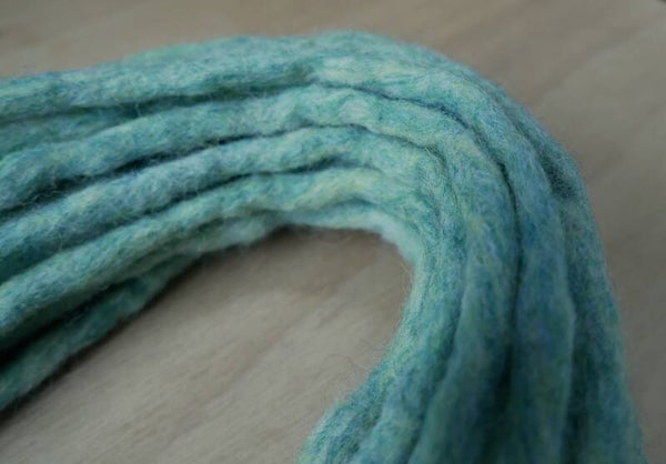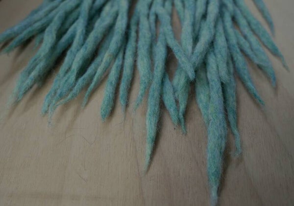 het is een natuurlijk product dat gemaakt is van merinowol. Ze worden door mij tot dreads gemaakt. De lengtes en diktes kunnen soms wat van elkaar verschillen door dat het wol de ene keer wat meer krimpt en vilt dan de ander tijdens het maken ervan. Bij het samen stellen van de dreads zoek ik de meest bij elkaar passende lengtes en diktes bij elkaar uit zodat er geen verschil tot bijna geen verschil is.