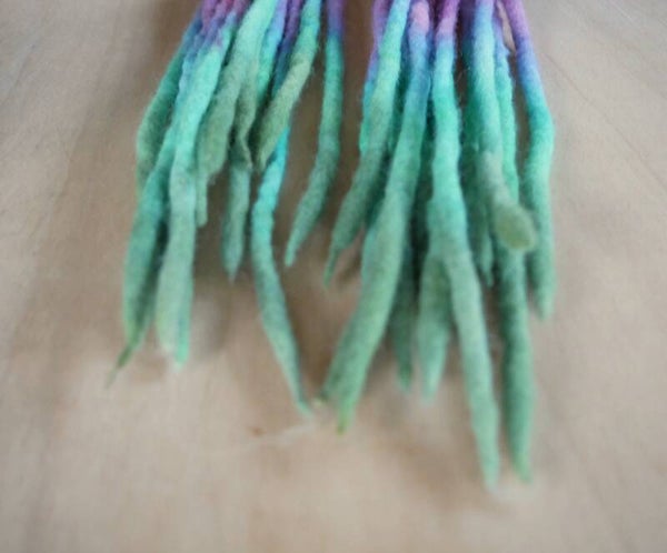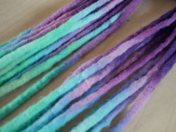 het is een natuurlijk product dat gemaakt is van merinowol. Ze worden door mij tot dreads gemaakt. De lengtes en diktes kunnen soms wat van elkaar verschillen door dat het wol de ene keer wat meer krimpt en vilt dan de ander tijdens het maken ervan. Bij het samen stellen van de dreads zoek ik de meest bij elkaar passende lengtes en diktes bij elkaar uit zodat er geen verschil tot bijna geen verschil is.
