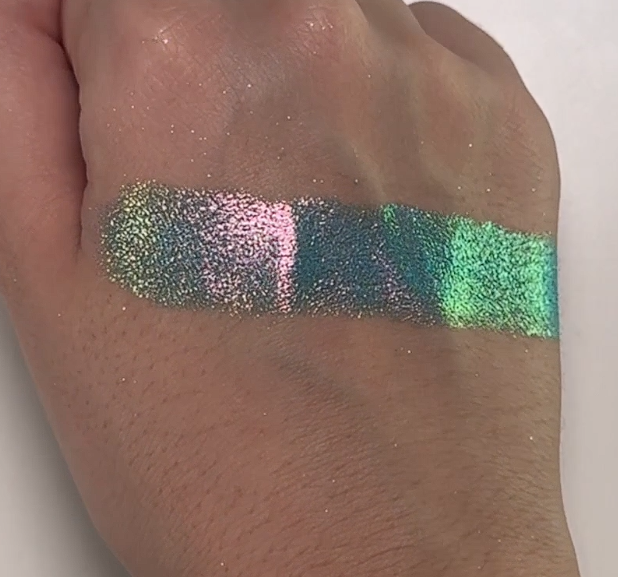 Multichroom met een glinsterende metallic afwerking die verschuift tussen grijs, blauw, groen, roze en goud.