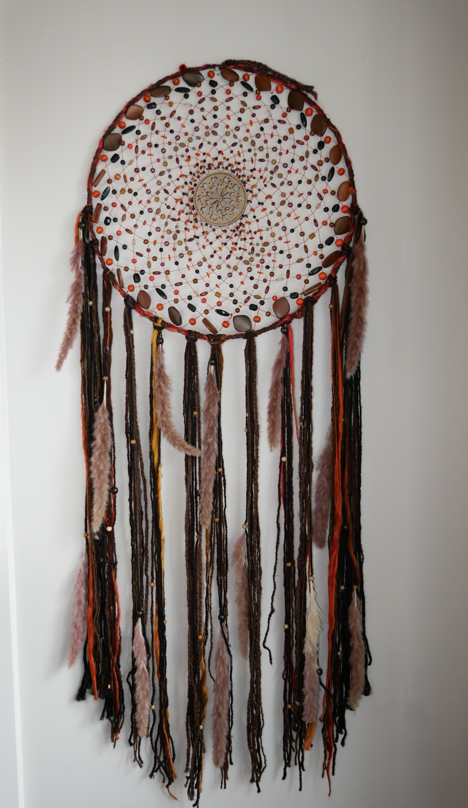 er worden allerlei verschillende soorten kralen gebruikt zoals houten kralen, natuursteen en plastic kralen met aan de onderkant lange slierten van verschillende soorten wol waaraan weer kralen ziten en pampasgras.