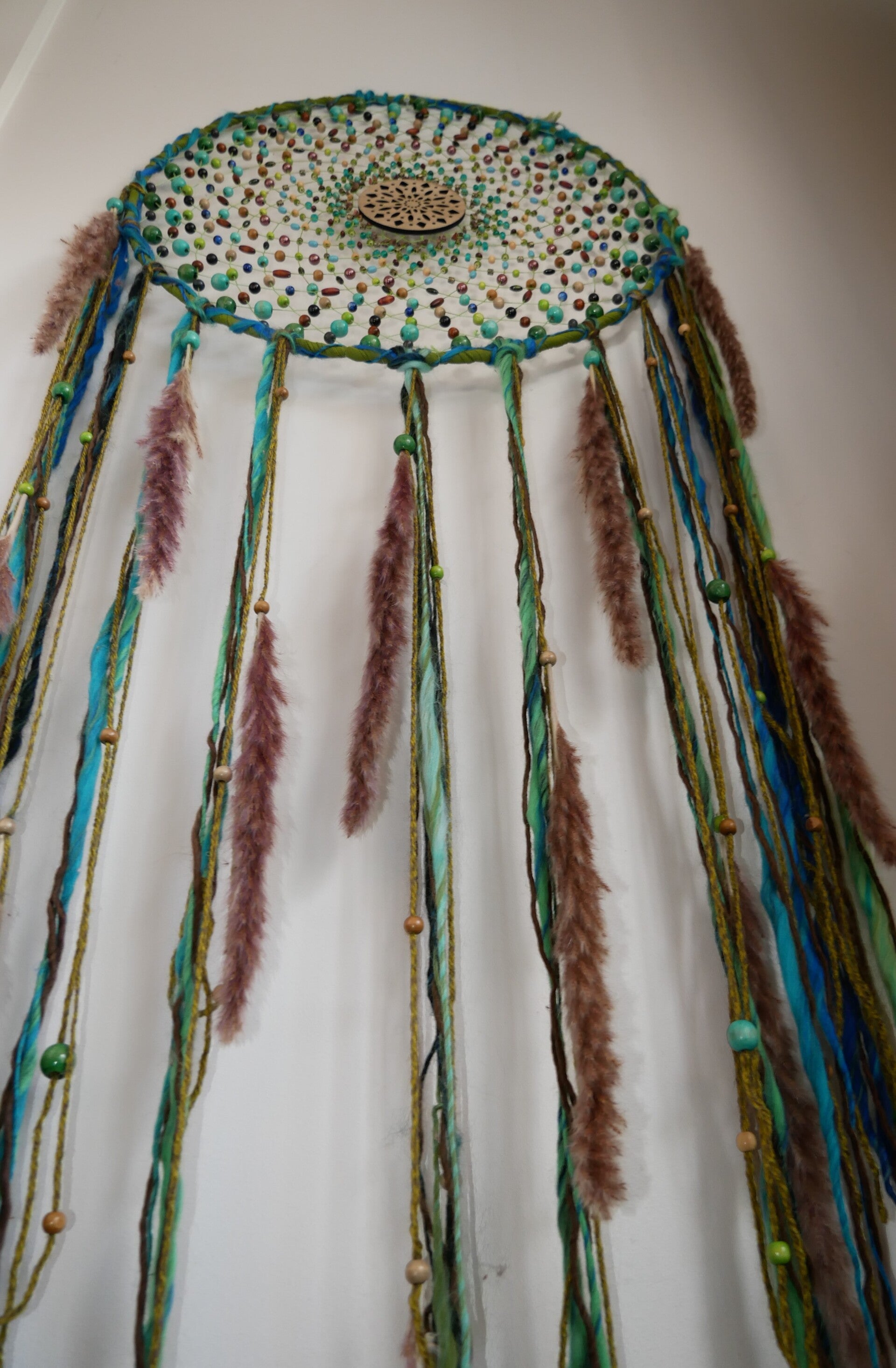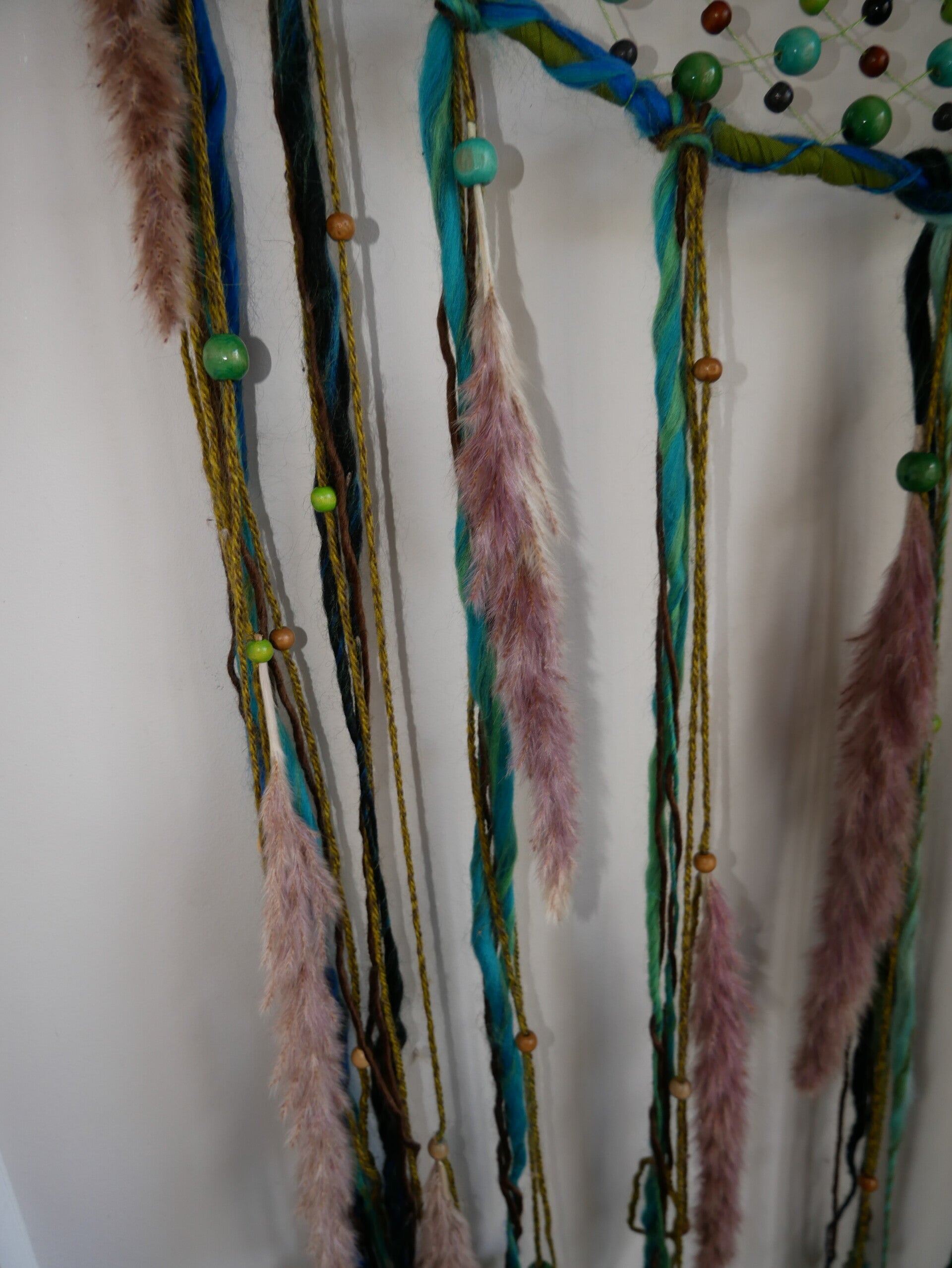 er worden allerlei verschillende soorten kralen gebruikt zoals houten kralen, natuursteen en plastic kralen met aan de onderkant lange slierten van verschillende soorten wol waaraan weer kralen ziten en pampasgras.