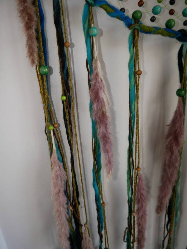 Deze dromenvanger bevat hout, wol, pampasgras, houten en plastic, glazen en natuursteen kralen.