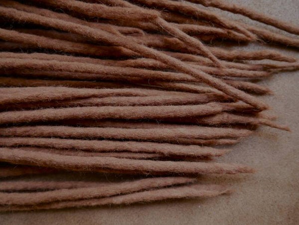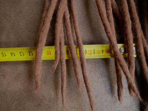 het is een natuurlijk product dat gemaakt is van merinowol. Ze worden door mij tot dreads gemaakt. De lengtes en diktes kunnen soms wat van elkaar verschillen door dat het wol de ene keer wat meer krimpt en vilt dan de ander tijdens het maken ervan. Bij het samen stellen van de dreads zoek ik de meest bij elkaar passende lengtes en diktes bij elkaar uit zodat dat er geen verschil tot bijna geen verschil is.